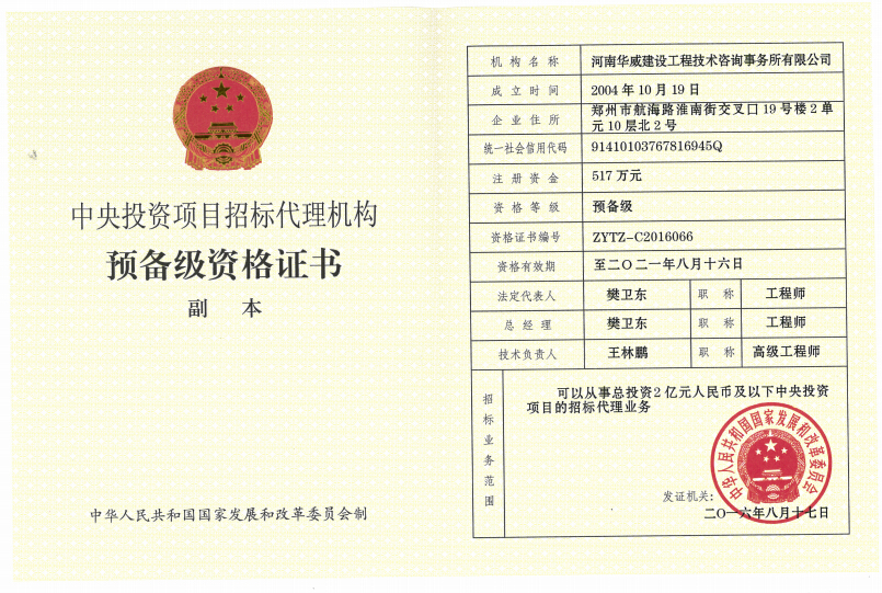 為增強我公司的競爭實力,擴大業(yè)務范圍,依據(jù)《中央投資項目招標代理資格管理辦法》,我公司認真準備相關材料并積極申請,于20168月取得“中央投資項目招標代理預備級”資質(zhì),可以從事總投資2億元人民幣及以下中央投資項目的招標代理業(yè)務。我公司將按照有關法律法規(guī)的要求,嚴格按照招標程序和工作規(guī)范執(zhí)業(yè),為客戶提供更加優(yōu)質(zhì)的服務!