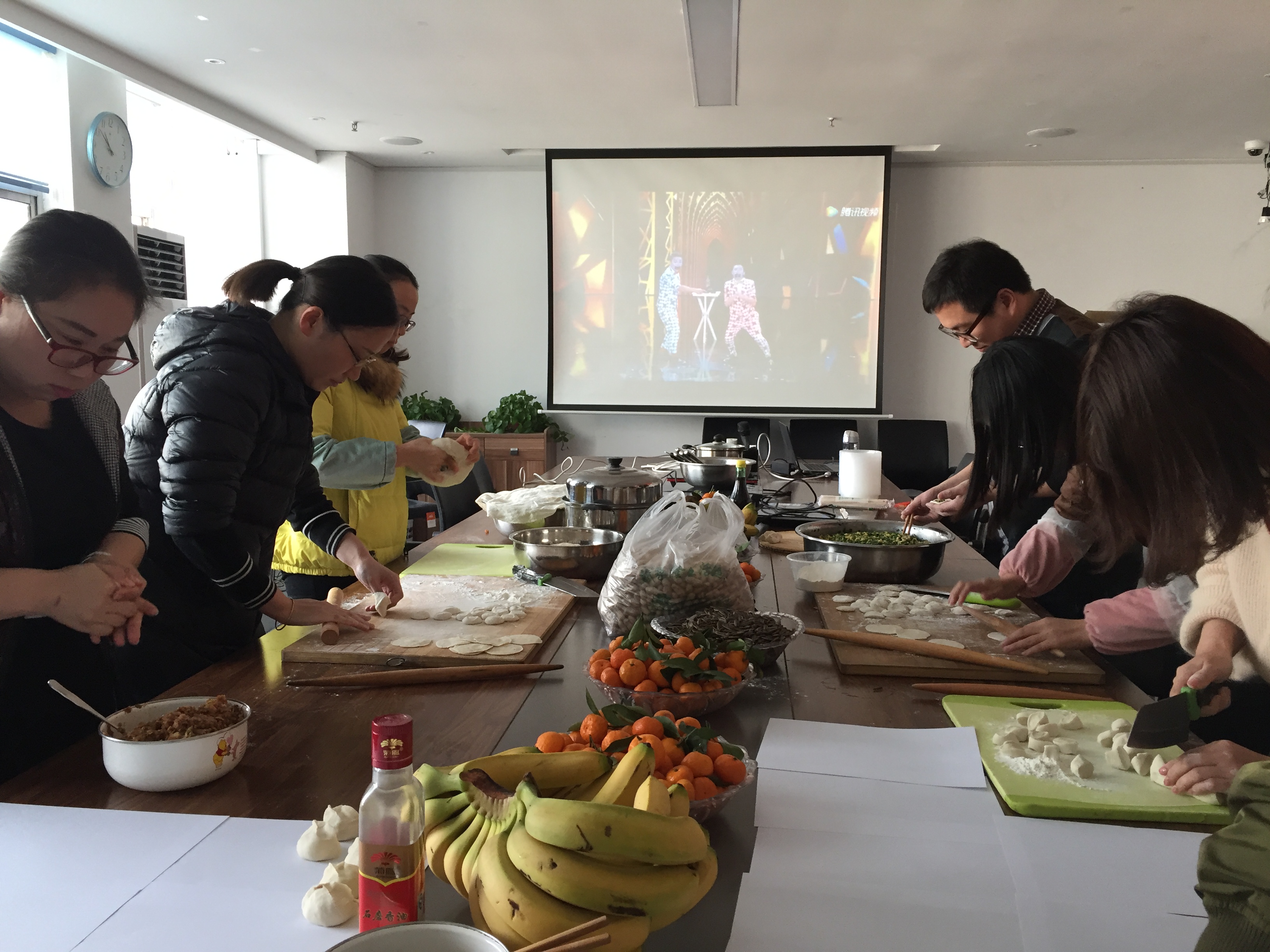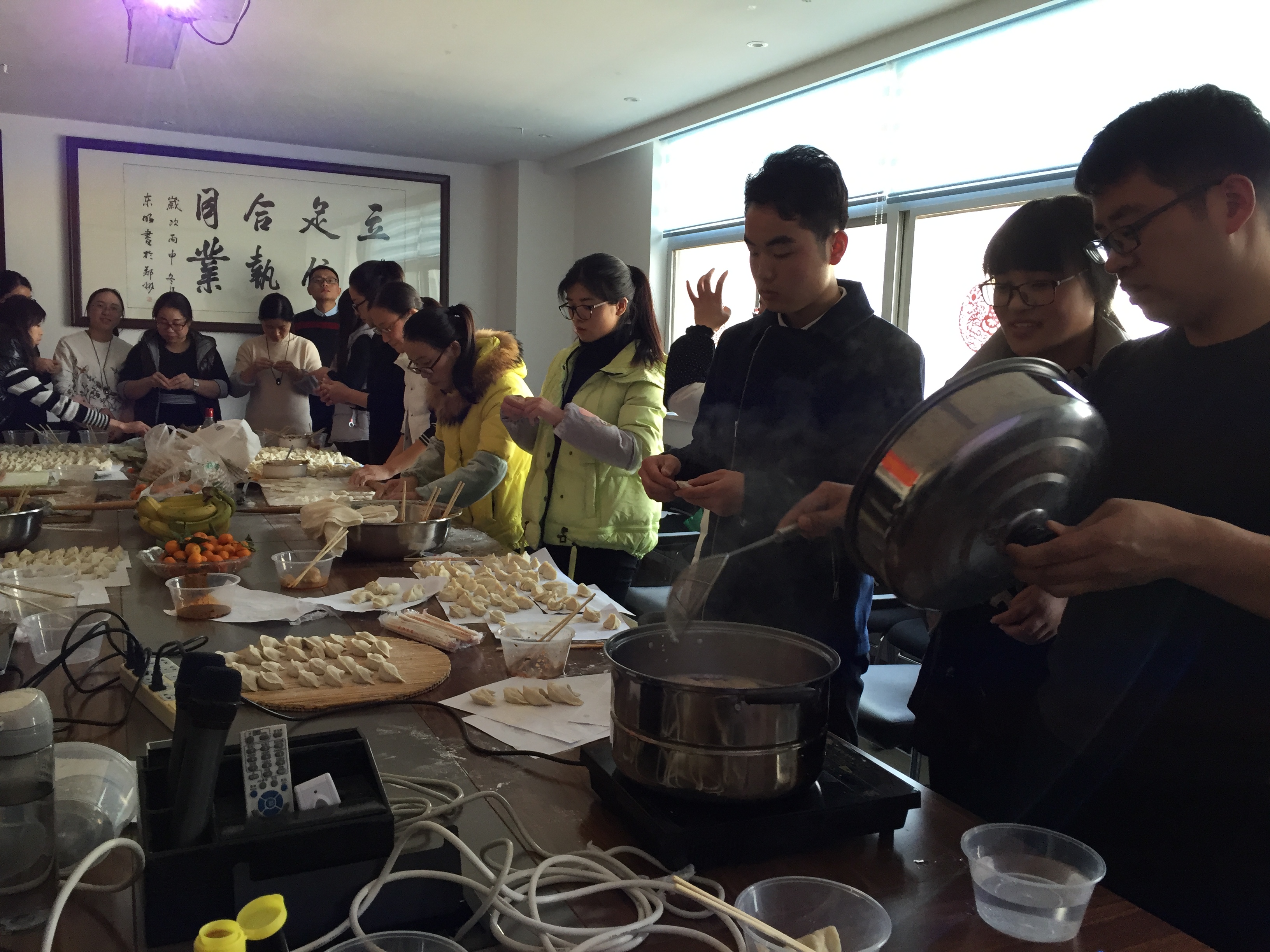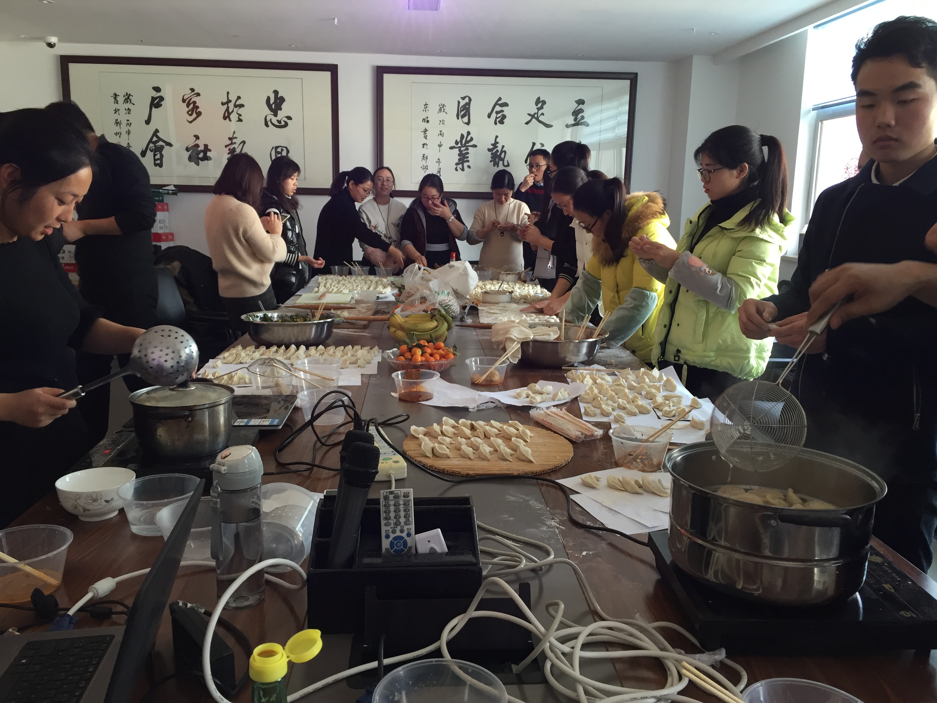 兩個(gè)小時(shí)之后,只見(jiàn)滿(mǎn)滿(mǎn)一桌包好的餃子。這是所有員工齊心協(xié)力的成果,大家的臉上都洋溢著快樂(lè)滿(mǎn)足的笑容?!跋嘛溩訃D!”大家伙兒總算可以吃上自己包的餃子了,一鍋又一鍋,香味四溢。大家交談著,玩笑著,吃著玩著,今年的耳朵不會(huì)凍掉了!