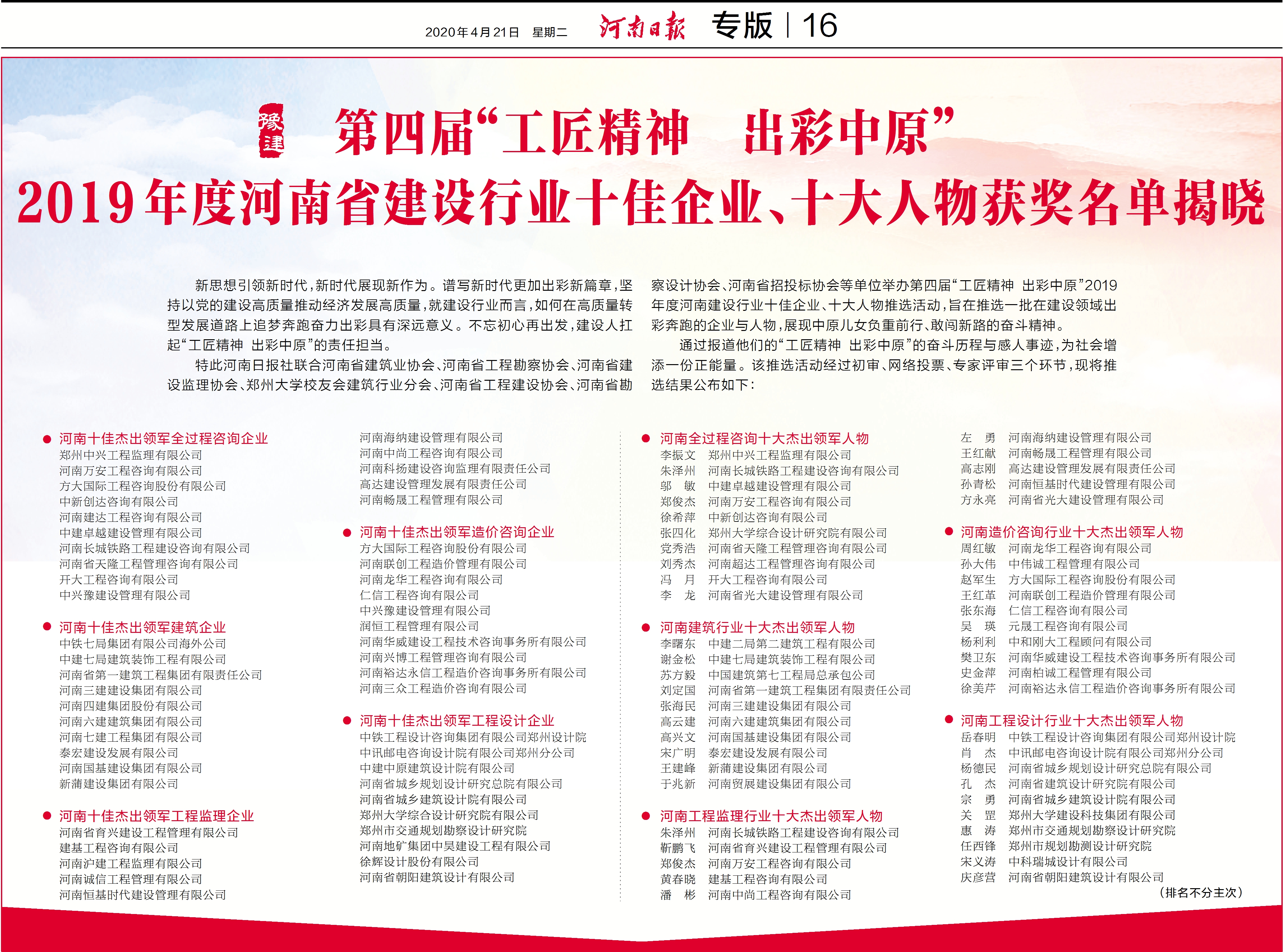 特此河南日?qǐng)?bào)社聯(lián)合河南省建筑業(yè)協(xié)會(huì)、河南省工程勘察協(xié)會(huì)、河南省建設(shè)監(jiān)理協(xié)會(huì)、鄭州大學(xué)校友會(huì)建筑行業(yè)分會(huì)、河南省工程建設(shè)協(xié)會(huì)、河南省勘察設(shè)計(jì)協(xié)會(huì)、河南省招投標(biāo)協(xié)會(huì)等單位舉辦第四屆“工匠精神 出彩中原”2019年度河南建設(shè)行業(yè)十佳企業(yè)、十大人物推選活動(dòng),旨在推選一批在建設(shè)領(lǐng)域出彩奔跑的企業(yè)與人物,來(lái)展現(xiàn)出中原兒女負(fù)重前行、敢闖新路的奮斗精神。