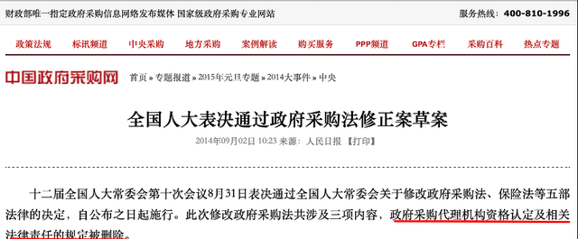 ◆ 2014年8月31日下午,全國(guó)人大常委會(huì)會(huì)議表決通過(guò)《政府采購(gòu)法》修正案,取消政府采購(gòu)代理機(jī)構(gòu)的資格認(rèn)定。2014年9月26日財(cái)政部印發(fā)了《關(guān)于做好政府采購(gòu)代理機(jī)構(gòu)資格認(rèn)定行政許可取消后相關(guān)政策銜接工作的通知》(財(cái)庫(kù)〔2014〕122號(hào))。