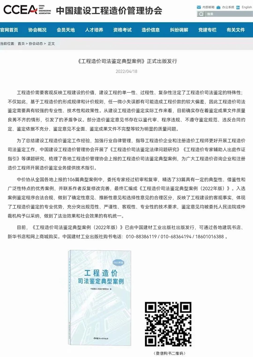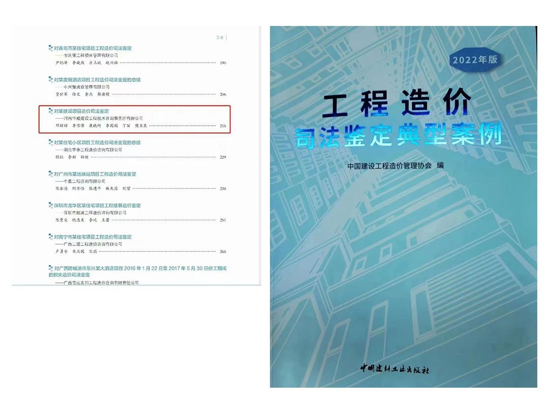 近日,中價協正式出版2022版《工程造價司法鑒定典型案例》,河南華威司法鑒定項目《對某建設項目造價司法鑒定》入選本書典型案例(216頁)