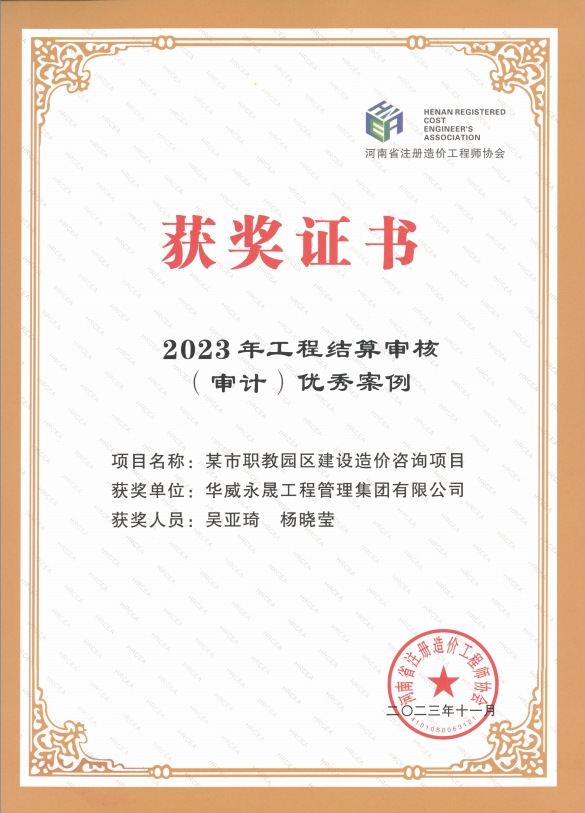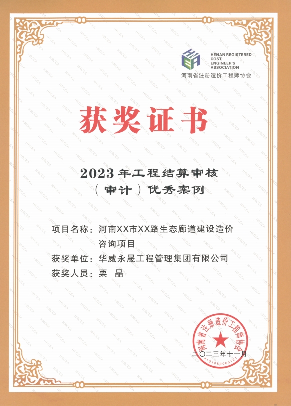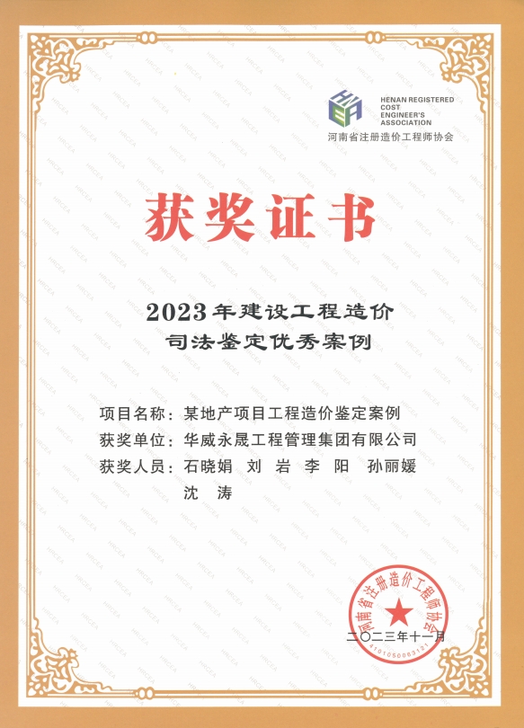 近日,我司榮獲河南省注冊造價工程師協(xié)會“2023年度先進(jìn)單位會員”稱號,《河南XX市XX路生態(tài)廊道建設(shè)造價咨詢項目》、《某市職教園區(qū)建設(shè)造價咨詢項目》、《某地產(chǎn)項目工程造價鑒定案例》三個項目被河南省注冊造價工程師協(xié)會評為優(yōu)秀案例。